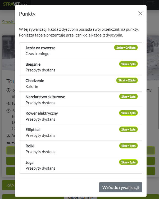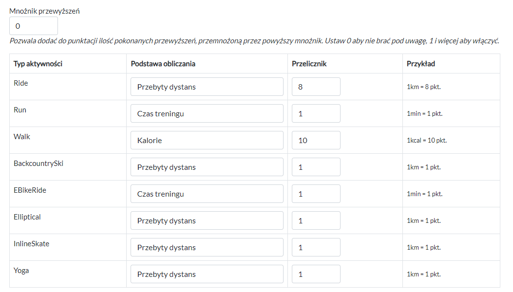 System pozwala na przypisanie wagi dla każdej z dyscyplin, a następnie w ramach jednej rywalizacji przeliczanie kilometrów, czasu lub kalorii na punkty aby sprawiedliwie nagradzać każdego uczestnika, nawet jeśli uprawia dyscyplinę gdzie kilometrów jest mniej, ale jest bardziej wymagająca (np. bieganie vs rower)